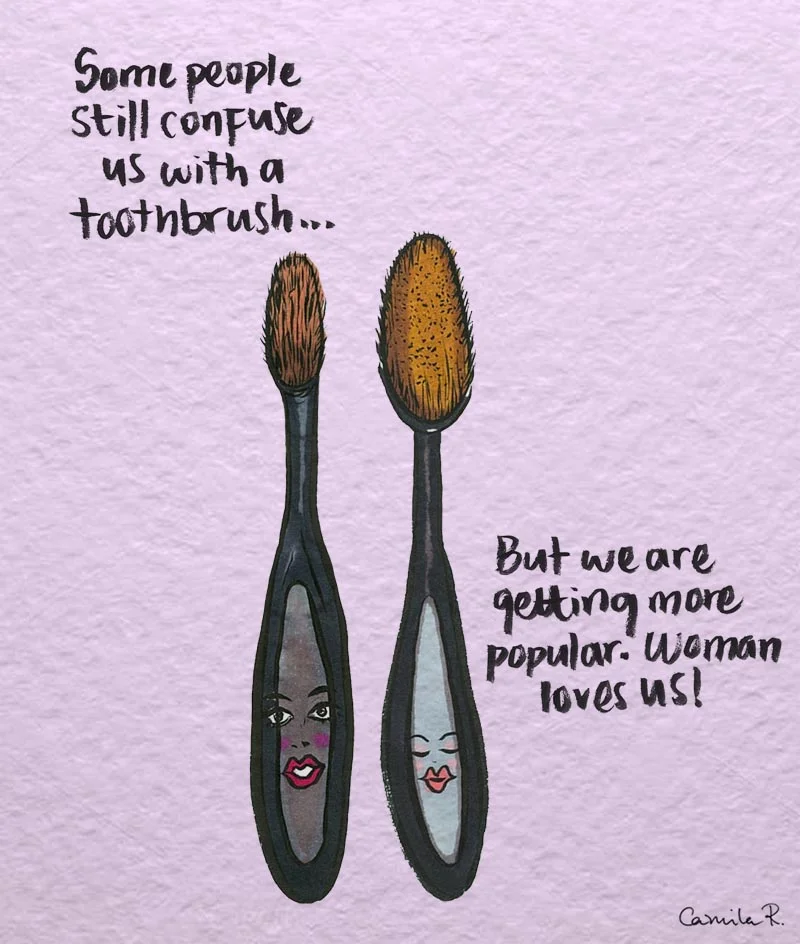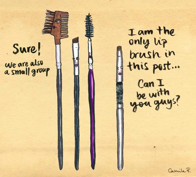 The lip brush with her eyebrow brushes friends.