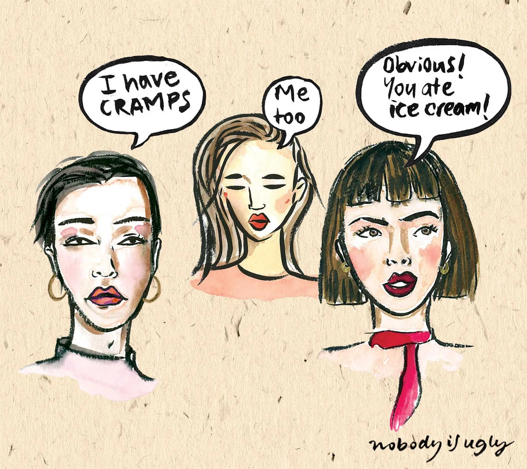 Nothing cold, no coffee and no ice cream as it clogs the chi. For menstrual cramps they recommend hot water with brown sugar and ginger.